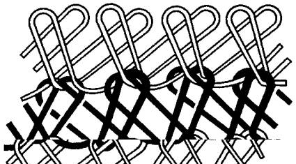 2x2羅紋:瑞士羅紋,連串的正面兩支相連縱行線圈交替背面兩支相連縱行線圈,織片結(jié)構(gòu)擁有高度彈性和不會(huì)卷邊。