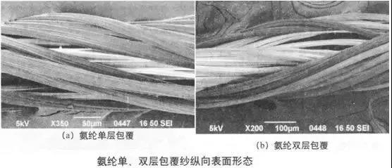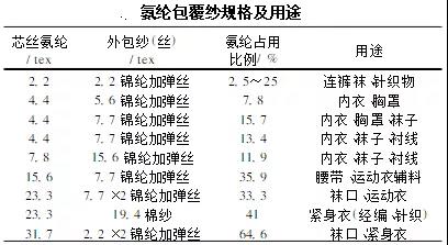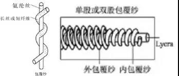 氨綸包覆紗是以氨綸絲為芯,以長絲或短纖維紗線按螺旋形的方式對伸長狀態(tài)的氨綸絲予以包覆而形成的彈力紗。