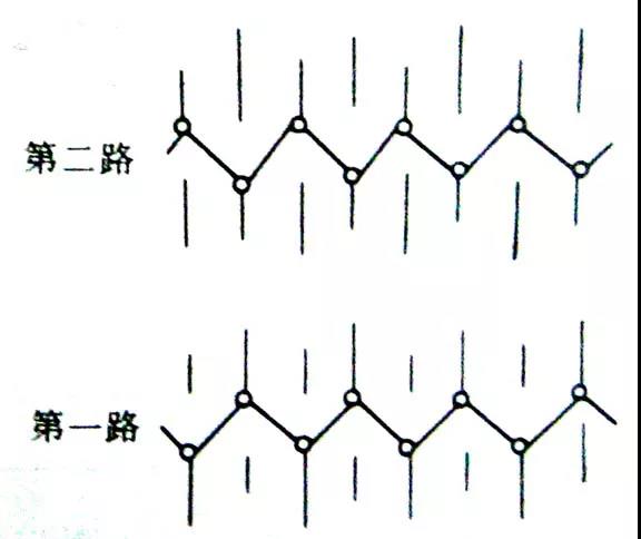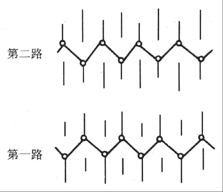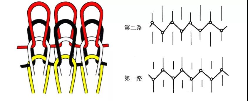 (2)一個(gè)線圈橫列由相鄰兩個(gè)成圈系統(tǒng)形成(兩根紗線),因此同一橫列上相鄰線圈在縱向彼此相差半個(gè)圈高。