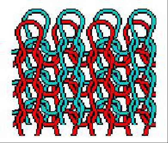 俗稱棉毛組織,由兩個(gè)羅紋組織彼此復(fù)合而成的雙面緯編組織,在一個(gè)羅紋組織線圈縱行之間配置了另一個(gè)羅紋組織的線圈縱行。