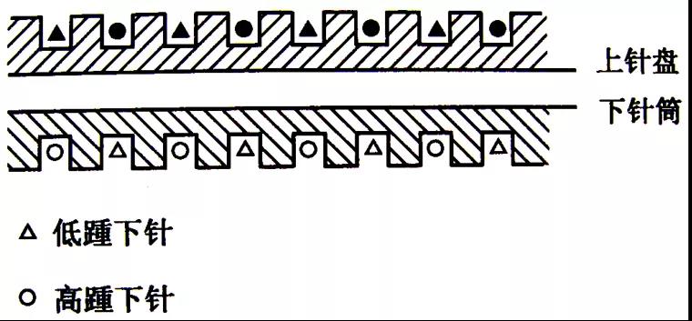 雙羅紋組織由兩根紗線形成一個(gè)線圈橫列,一根紗線編織時(shí),下針筒的奇數(shù)針和上針盤的偶數(shù)針相配合形成一個(gè)1+1羅紋;另一根紗線編織時(shí),下針筒的偶數(shù)針與上針盤的奇數(shù)針相配合形成另一個(gè)1+1羅紋。互鎖形成雙羅紋組織。