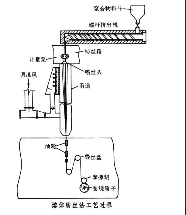 熔體紡絲方法的主要特點(diǎn)是紡絲速度高(1000~7000m/min),無(wú)需溶劑和沉淀劑及其回收、循環(huán)系統(tǒng),設(shè)備簡(jiǎn)單,工藝流程短,是一種經(jīng)濟(jì)、方便和效率高的成形方法。但噴絲頭孔數(shù)相對(duì)較少。