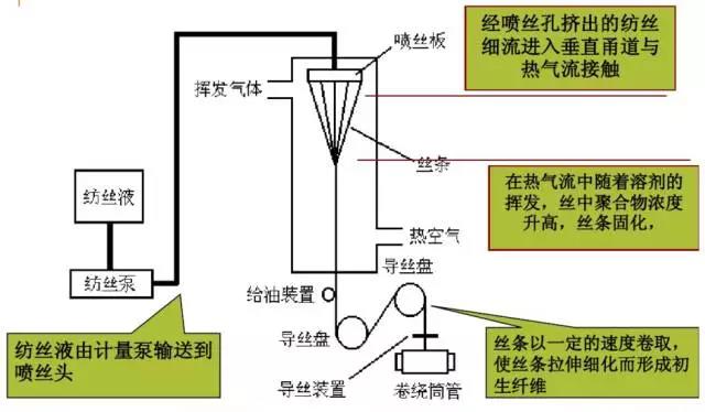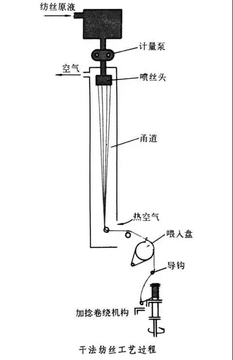 紡絲液的濃度比濕法高,一般可達(dá)18%~45%,相應(yīng)的粘度也高,能承受比濕紡更大的噴絲頭拉伸(2~7倍),易制得比濕紡更細(xì)的纖維。