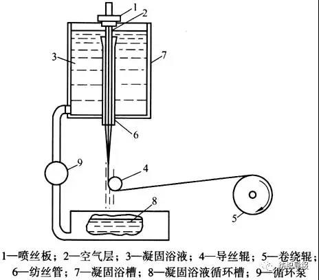 即將成纖高聚物溶解在某種溶劑中制備成具有適宜濃度的紡絲溶液,再將該紡絲溶液從微細(xì)的小孔吐出,首先經(jīng)過(guò)一段很短的空氣夾層,在此處由于絲條所受阻力較小,處于液晶態(tài)的高分子有利于在高倍拉伸條件下高度取向,而后絲條再進(jìn)入低溫的凝固浴完成固化成型,并使液晶大分子處于高度有序的凍結(jié)液晶態(tài),制得的成品纖維,具有高強(qiáng)度、高模量的力學(xué)性能。