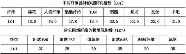 與火源接觸后,纖維不能燃燒(如玻璃纖維),或燃燒反應(yīng)不充分,僅有較小火焰燃燒(如氯綸),火源撤走后,火焰能較快地自行熄滅的纖維都可稱作阻燃纖維。根據(jù)纖維的極限氧指數(shù)(LOI)值,一般認(rèn)為氧指數(shù)<22屬于易燃材料,氧指數(shù)在22~27之間屬可燃材料,氧指數(shù)>27屬難燃材料。常見合成纖維和阻燃纖維的LOI如下表所示。