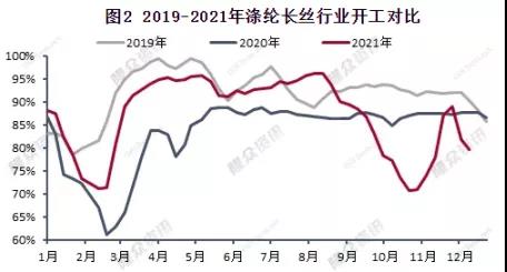 11月月底國內(nèi)部分生產(chǎn)企業(yè)減產(chǎn)保價,滌綸長絲行業(yè)開工降至8成以下,期間江蘇、福建兩地前期減停裝置陸續(xù)重啟,行業(yè)開工小幅提升,近日部分廠商裝置減產(chǎn),滌綸長絲行業(yè)開工率再度下降,整體開機(jī)率在8成以下,而目前冬季訂單已告罄,春季訂單稀少,一方面海外疫情并未有效控制,海運(yùn)費居高不下,另一方面國內(nèi)多地疫情反復(fù),導(dǎo)致行業(yè)人士信心不足,滌綸長絲目前行業(yè)開工已處于同期相對較低的水平,然織造整體開工在6成以下,供需矛盾下滌綸長絲開工仍有下降的預(yù)期。綜上,多重利空拖累下,滌綸長絲供需將出現(xiàn)雙降的局面。