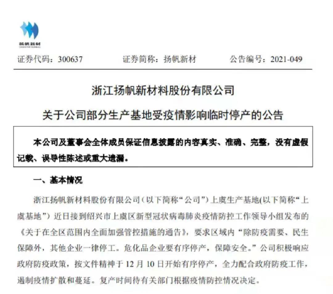 12月10日早間,揚帆新材發(fā)布公告稱,公司上虞生產(chǎn)基地(“上虞基地”)近日接到紹興市上虞區(qū)加強管控措施的通知,要求區(qū)域內(nèi)“除防疫需要、民生保障外,其他企業(yè)一律停工。危化品企業(yè)要有序停產(chǎn),保障安全?!?/strong>公司積極響應(yīng)政府防疫政策,按文件精神于12月10日開始有序停產(chǎn),復(fù)產(chǎn)時間待有關(guān)部門根據(jù)疫情防控情況決定。