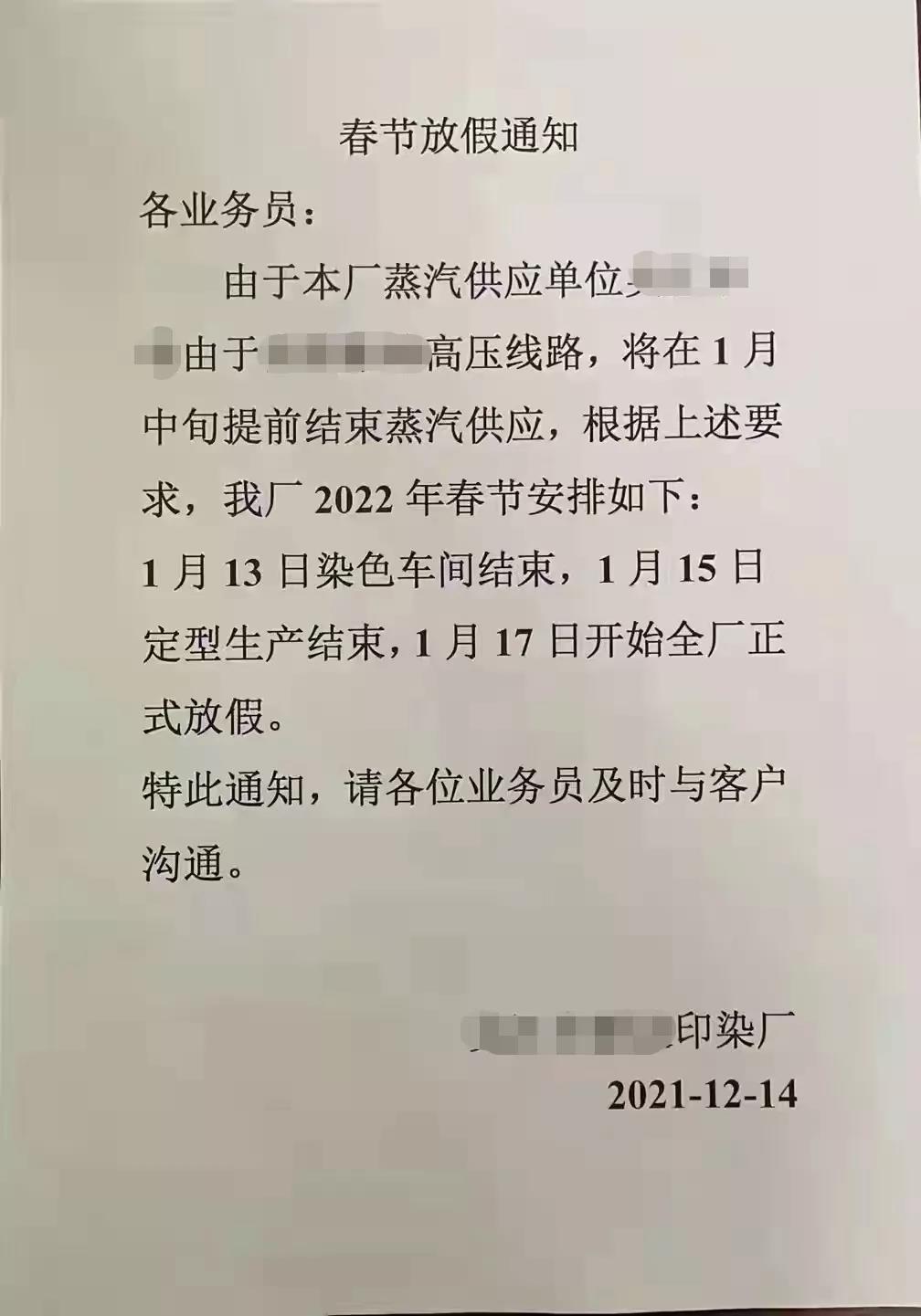 1月中旬放春節(jié),這個時間點根據(jù)往年的情況來看是非常合理的,但每年染廠都是堅持到最后的工廠,相對印染市場來說是提前的。但也因蒸汽供應(yīng)停止的原因,沒有選擇的余地。