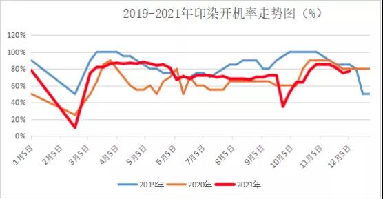 目前,江浙地區(qū)染廠的開機率處于一個不溫不火的狀態(tài),維持在7成左右,部分7成偏下,部分8成左右。雖然這個開機率已接近今年最高點,但與往年相比還是處于一個較低的水平。往年此時,雖然是一年的收尾階段,但在春節(jié)放假前,往往會有一批訂單下達,為春節(jié)放假的空窗期做好準備。因此往年的染廠還是偏忙碌的,從圖中也可以看出,前2年的染廠開機率在8成偏上。