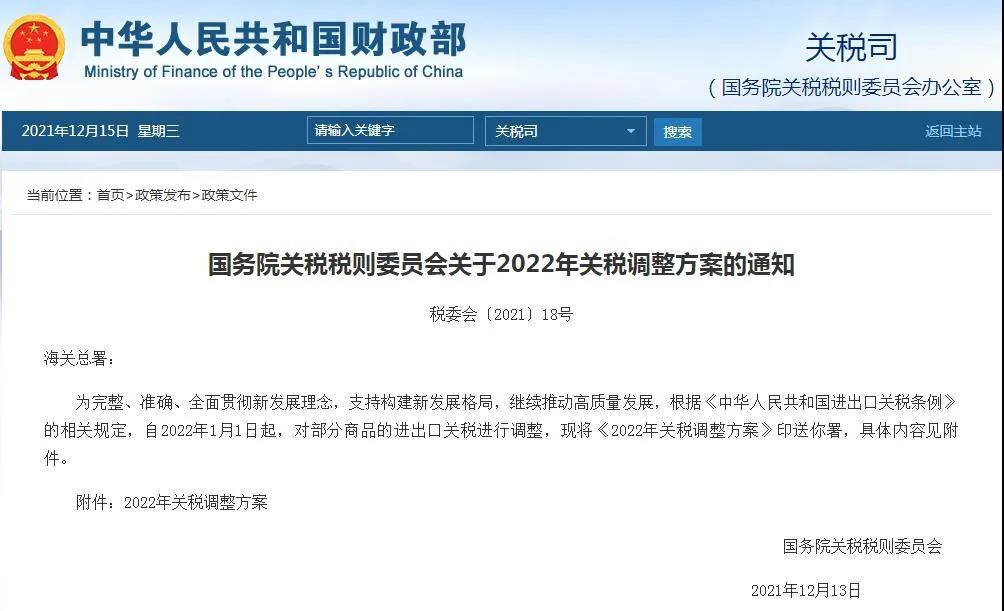 12月15日,國務(wù)院關(guān)稅稅則委員會發(fā)布2022年關(guān)稅調(diào)整方案,對部分商品的進出口關(guān)稅進行調(diào)整。相關(guān)方案,除另有規(guī)定外,自2022年1月1日起實施。