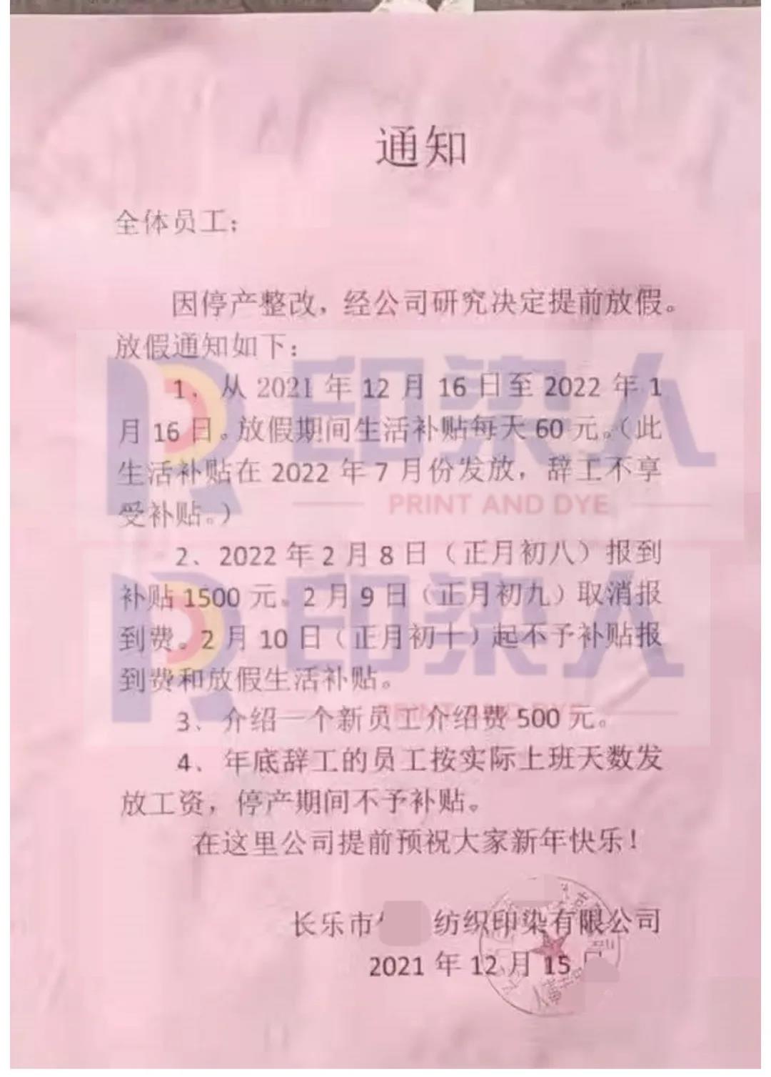 印染人從渠道獲悉,福建長樂某印染廠因停產(chǎn)原因,自12月16日開始放假,2022年2月8日員工報道,并對放假期間補助進行詳細說明。