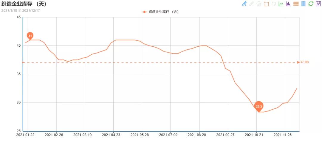 另一方面,近期由于浙江疫情及年底需求較差,市場傳言今年紡織廠的放假時間可能會出現(xiàn)提前的情況。目前織造廠家的庫存正處于上升階段,據(jù)綢都網(wǎng)數(shù)據(jù)監(jiān)測顯示,目前織造廠家的庫存在32.5天左右,較11月上升4天。另外江浙多地紡織廠及貿(mào)易商反饋,近一周多來常規(guī)坯布詢價和出貨仍沒有多大起色,成交價明顯回落,部分廠家調(diào)整幅度超過20%。同時原料價格也以小幅陰跌為主。