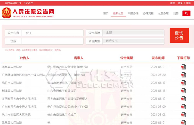 據(jù)人民法院公告網(wǎng)顯示,2020年至今,破產(chǎn)化企超過300家。