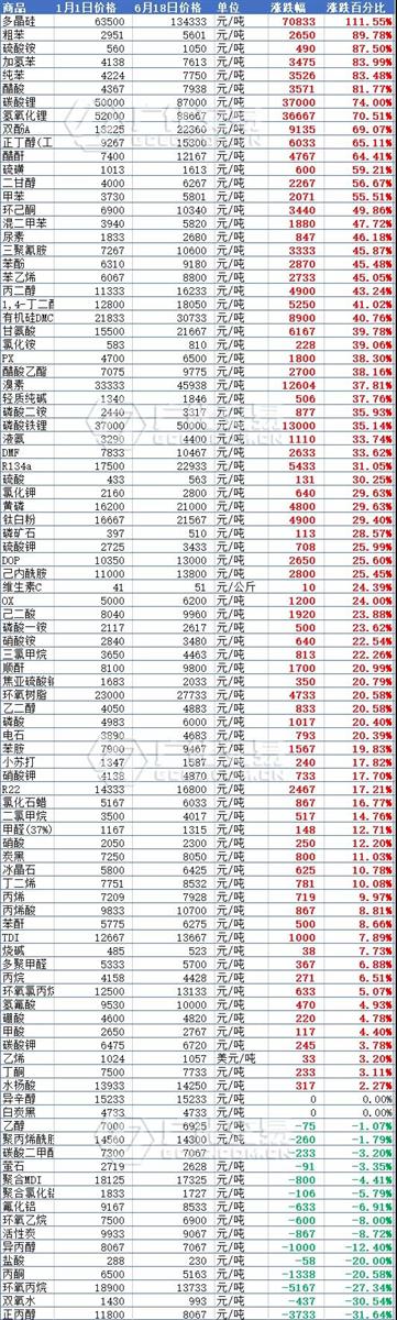 可以看到,盡管二季度化工產(chǎn)品價(jià)格有所回落,但整體來看,化工品今年仍有較大的漲幅。
