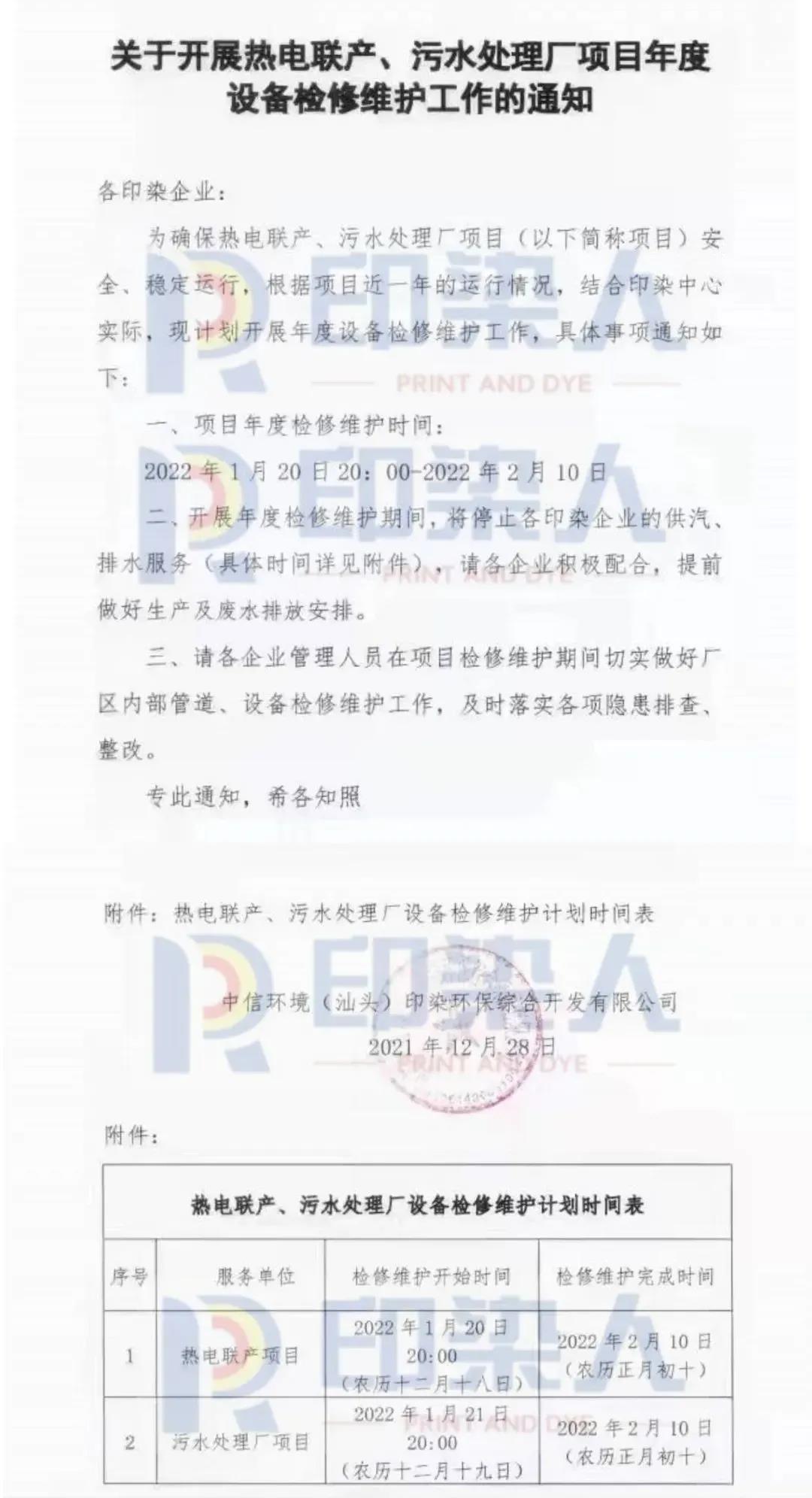 近日,中信環(huán)境(汕頭)印染環(huán)保發(fā)布《關(guān)于開(kāi)展熱電聯(lián)產(chǎn)、污水處理廠項(xiàng)目年度設(shè)備檢修維護(hù)工作的通知》,告知園區(qū)各印染企業(yè),將于2022年 1月 20日 20:00開(kāi)始項(xiàng)目年度檢修維護(hù)工作。