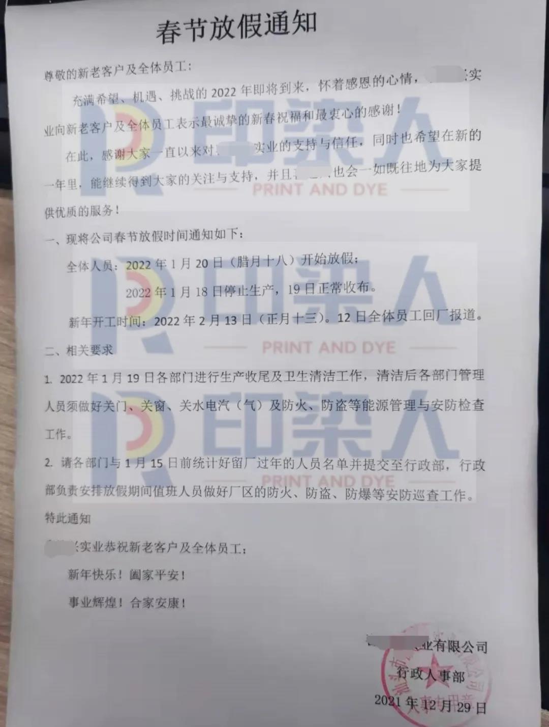 與此同時(shí),潮南印染產(chǎn)業(yè)園有印染企業(yè)發(fā)出《春節(jié)放假通知》,具體時(shí)間為:2022年 1月 20日開(kāi)始放假,2022年 2月12日全體員工回廠報(bào)道。并對(duì)放假期間的工作進(jìn)行了安排。