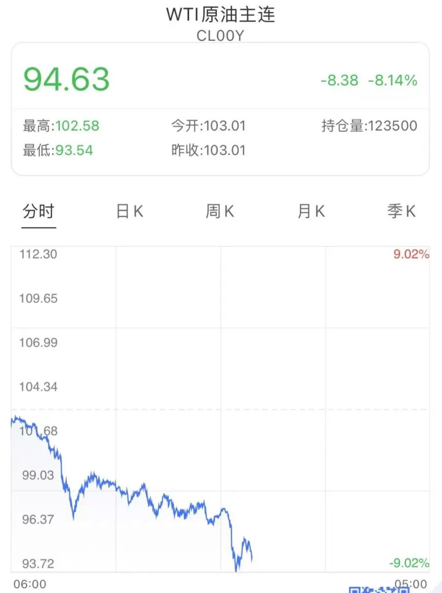 截至發(fā)稿,布油價格大跌7.85%至98.51美元/桶,3月1日以來首次盤中跌穿100美元/桶,較月高回落近40美元;WTI原油價格跌8.31%至94.45美元/桶,周一,該品種價格就已失守100美元大關(guān)。
