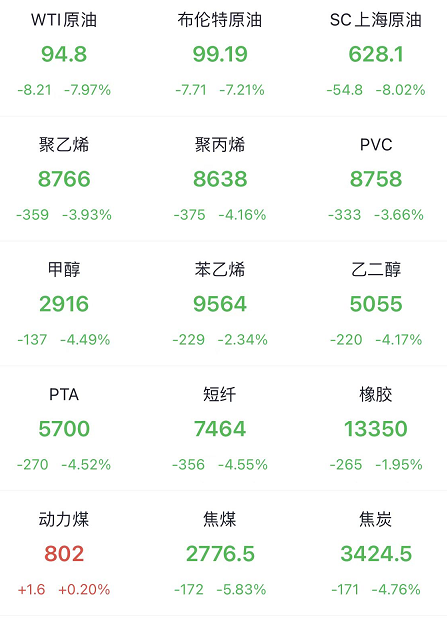 國內(nèi)能源化工市場,也是慘不忍睹!上海原油跌超6%,PP、PE、甲醇跌超2%,PVC跌1.69%,苯乙烯跌1.06%,自上而下的,原油帶著各大衍生化工品一起跌!