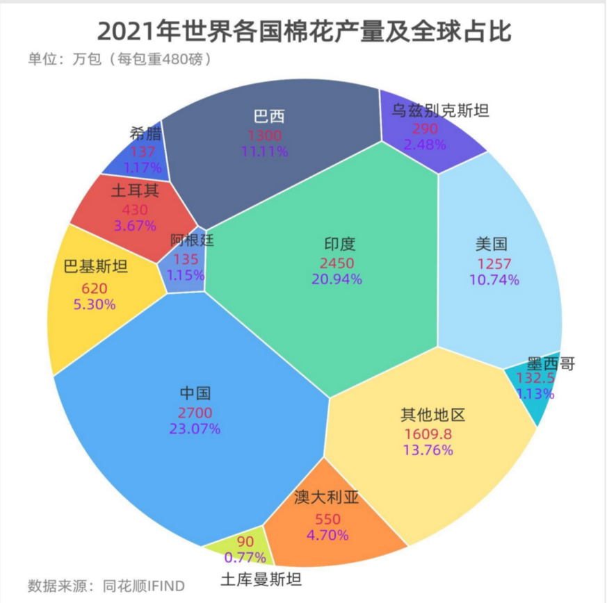 2021/2022年度,中國以2700萬包(每包重480磅)位居全球第一棉花生產(chǎn)國,占全球總產(chǎn)量的23.07%,印度以2450萬包的產(chǎn)量僅次于中國,而巴基斯坦棉花年產(chǎn)量為620萬包,占全球總產(chǎn)量的5.3%,位列第五名。巴基斯坦規(guī)劃部長表示,巴基斯坦將面臨糧食短缺,因為歷史上最嚴重的洪災(zāi)造成農(nóng)作物損失。巴基斯坦45%的棉花作物被洪水沖走,水果、蔬菜和大米作物也遭受巨大損失。受此影響,如果產(chǎn)量下降,該國紡織行業(yè)將被迫進口更多棉花,從而進一步推高國際棉花市場價格。由于今年美國、巴西、其他國家的棉花作物產(chǎn)量下降,全球市場已面臨供應(yīng)減少。下圖為2021年全球棉花產(chǎn)量分布及全球占比,具體如下: