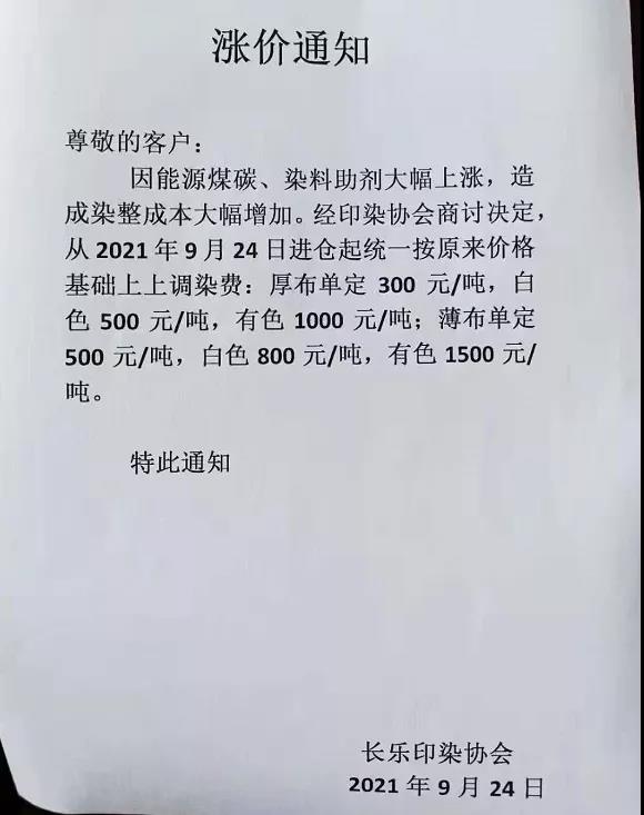 紡織印染生產(chǎn)地,也有印染企業(yè)實在受不了生產(chǎn)成本的高漲發(fā)出染費調(diào)整的通知。來看市場最新消息。