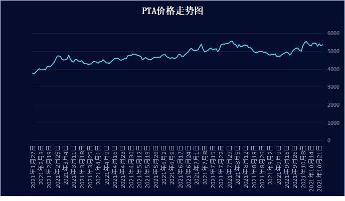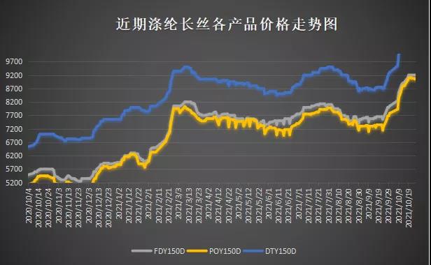 受動力煤影響,上游化纖原料PTA、乙二醇、滌綸長絲等聚酯產(chǎn)品價格開始出現(xiàn)回調(diào)現(xiàn)象。PTA在上周沖高后連續(xù)下跌,期貨價格較10月15日下降80元/噸。2021年四季度以來,滌綸長絲價格震蕩上揚,遠(yuǎn)超2019-2020年同期價格,在10月中旬達(dá)到近期最高值。但隨后開始出現(xiàn)下跌,目前震蕩運行,似乎漲勢結(jié)束。從下圖的曲線圖中我們也可以看到下跌趨勢,原料價格踩下上漲剎車,或恢復(fù)低價。