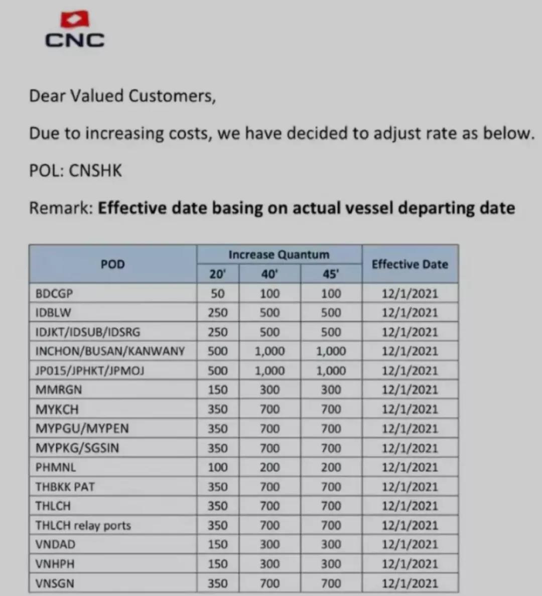 蛇口港至泰國(guó)曼谷、林查班港,漲價(jià)USD350/700/700;蛇口至仁川釜山等港口,直接漲價(jià)USD500/1000/1000