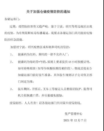 近期,疫情防控形勢又趨嚴(yán)峻。鑒于寧波、紹興等周邊地區(qū)出現(xiàn)的疫情,為有效阻斷病毒傳播蔓延,現(xiàn)要求各儲運(yùn)部門共同做好疫情防控應(yīng)急措施。